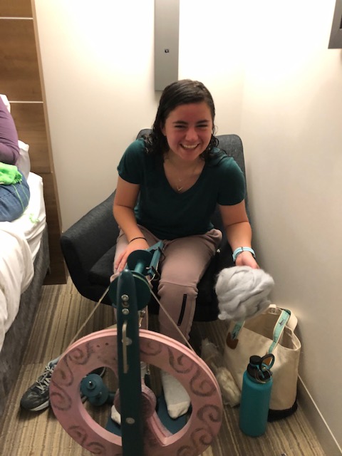 That evening, I did a treadmill workout (hence why I had to shower and had sopping wet hair), and we did some yarn spinning in our hotel room. My mom learned how to knit socks too. 😊 I accidentally matched the spinning wheel with my outfit. XD